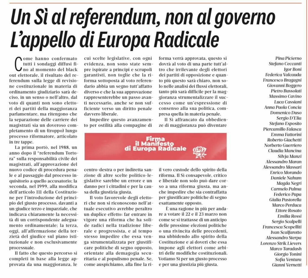 Nell’immagine l’appello pubblicato dal «Riformista», il 14 marzo 2026